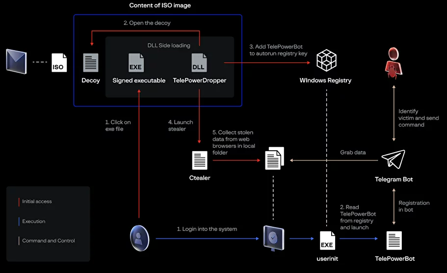 La primera cadena de infección se observa que la comunicación entre los dispositivos entre los actores de amenazas y las víctimas se basa en la API de Telegram. Esto se hace mediante módulos creados por el grupo, TelePowerBot y Kamikakabot, los cuales están desarrollados en diferentes lenguajes de programación. Uno está diseñado en PowerShell y el otro está programado en .NET con funcionalidades de Stealer que sirven para leer y ejecutar comandos a través de un bot de Telegram. Además, se usan herramientas personalizadas como Ctealer y Cucky para extraer credenciales y cookies de los navegadores y la herramienta ZMsg que permite recopilar mensajes enviados a través de aplicaciones tales como Telegram, Viber y Zalo.