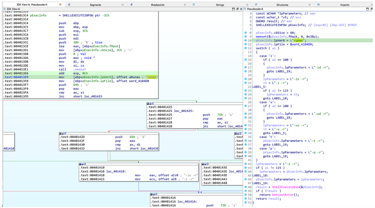 Se puede observar que lpVerb está configurado en "runas", lo que indica que el programa se ejecutará con privilegios de administrador, activando el Control de cuentas de usuario (UAC). Esto luego se ejecutará WifiAutoInstallDriver.exe, que se establece en lpFile.